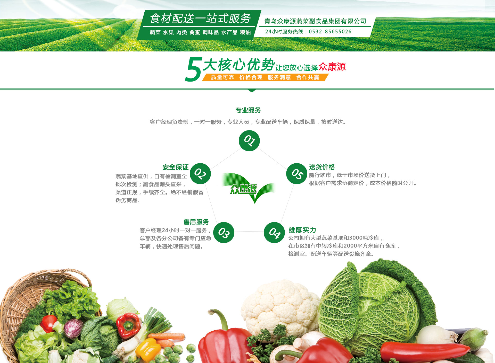 青島眾康源蔬菜副食品集團(tuán)有限公司是青島市“菜籃子工程”體系單位,“陽(yáng)光食品工程”首批推介的供貨單位。在各級(jí)政府、業(yè)務(wù)單位和廣大市民的關(guān)心支持下,各項(xiàng)業(yè)務(wù)發(fā)展迅速,連續(xù)多年被青島市"菜籃子"工程建設(shè)領(lǐng)導(dǎo)小組評(píng)為”青島市菜籃子暨三綠工程工作先進(jìn)單位”,被工商局評(píng)為“消費(fèi)者滿(mǎn)意單位”?,F(xiàn)在基本形成了以生態(tài)農(nóng)業(yè)公司蔬菜基地、蔬菜副食品物流配送中心為主體的農(nóng)產(chǎn)品種植、批發(fā)配送經(jīng)營(yíng)體系,以市場(chǎng)經(jīng)營(yíng)服務(wù)公司為主體的市場(chǎng)經(jīng)營(yíng)管理體系,蔬菜果品經(jīng)營(yíng)部、副食品經(jīng)營(yíng)部為主體的食品批發(fā)、代理體系和青島之星餐飲管理公司為主體的食堂承包、托管等服務(wù)的餐...